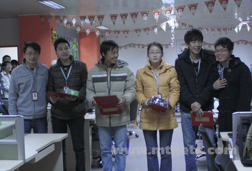 市場部曹林、周利松、潘俊海分別獲得11月個人銷售業績前三名,新進員工為獲獎者頒獎。意氣風發的市場精英