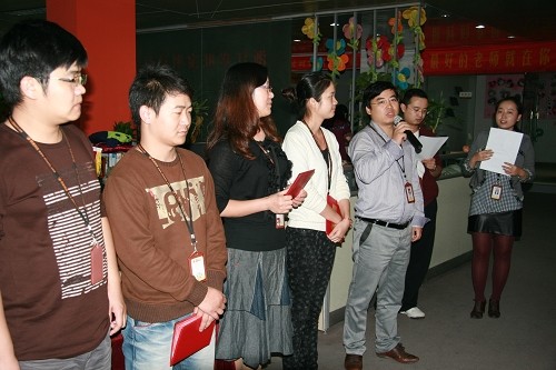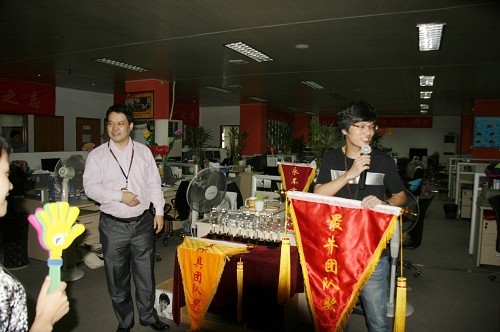 明通老員工,“資歷哥”詹玉明給虎隊PK勝出的同學頒發獎金