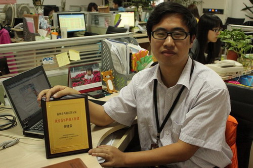 繼羅君、老王之后,產(chǎn)品中心的董曉貴也榮獲“西湖區(qū)優(yōu)秀青年科技工作者”這一殊榮,曉貴是貴州遵義人,早前來杭州打拼,09年5月份來到明通的,他戴著一副大框眼睛,外表看起來有點像剛大學(xué)畢業(yè)似的,笑起來也比較年輕的感覺,其實他已經(jīng)是孩子他爸了。