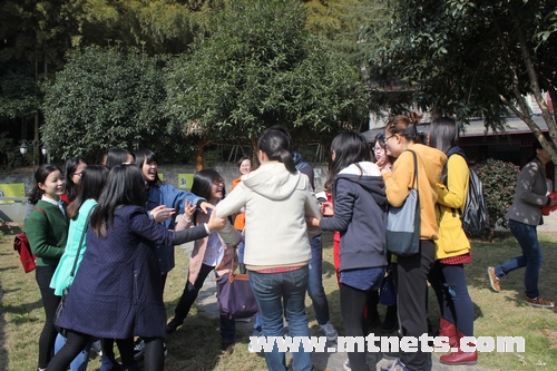 大家先在一個大草坪上休憩片刻,隨后玩起了“五毛一塊”的游戲。男生做五毛,女生做一塊。主持人喊:六塊五,那么必須牽手或者搭肩圍成一個圈。可以是6個女生與1個男生的組合,也可以是5個女生與3個男生的組合。由于編輯部男生少,于是主持人又想出一個更好的方案,戴眼鏡的算五毛,不戴眼鏡的算一塊,同時,戴眼鏡的又可靈活變動,摘下戴上,以免湊不齊或數(shù)量過多的出現(xiàn)。最后,令大家意想不到的是往往最后獲勝的兩位,還一起表演節(jié)目。玩伴們直呼過癮,卻也大呼上當,贏或者不贏都顯得好難。