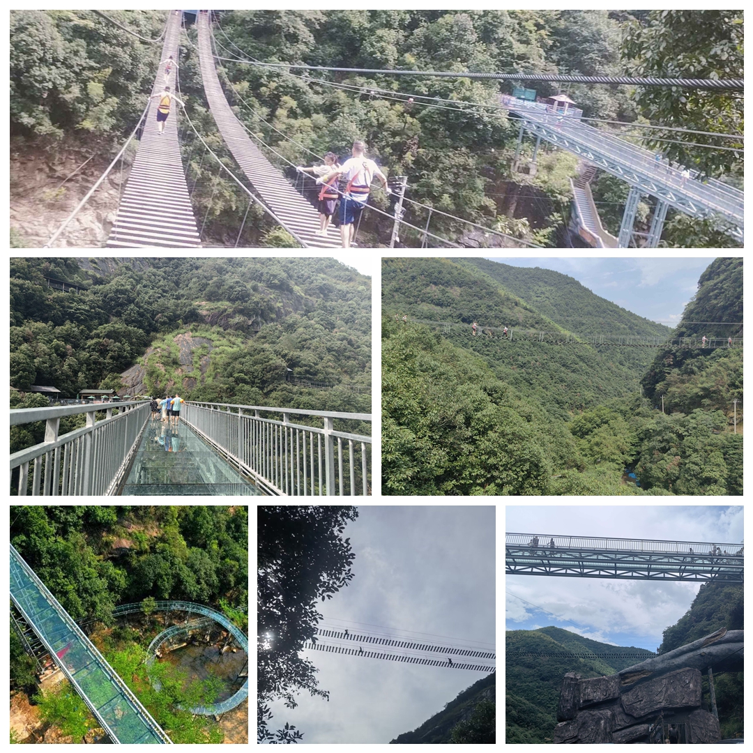 不同于峽谷漂流的怪石嶙峋、水花四濺,玻璃漂流水道要緩和許多,其間還能夠欣賞到蒼翠蔥蒙的山林景色。當然,在到達起點之前,需先經過一段玻璃棧道,垂直向下可看到林影密布與涓涓細流,仿佛在空中漫步,不遠處兩山之間還有繩索連接著的徽商古道,木板間隔鋪就,只能緩慢跨步前行,著實稱得上是“練膽”神器。