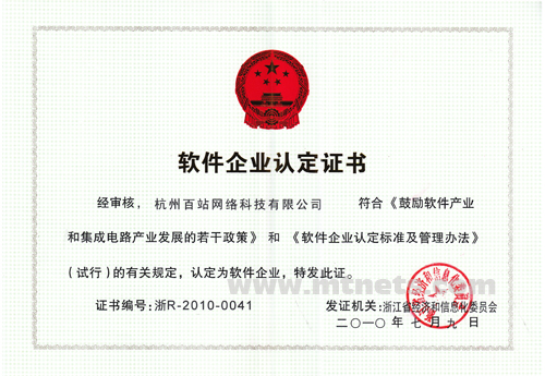 百站網(wǎng)絡(luò)致力于行業(yè)網(wǎng)站開發(fā)運(yùn)營(yíng)和企業(yè)電子商務(wù)解決方案服務(wù),始終堅(jiān)持核心技術(shù)的自主研發(fā)和服務(wù)軟件創(chuàng)新提升。此次認(rèn)證審批,是根據(jù)《軟件企業(yè)認(rèn)定標(biāo)準(zhǔn)及管理辦法》和《軟件產(chǎn)品管理辦法》的有關(guān)規(guī)定,由軟件行業(yè)協(xié)會(huì)受理、初審,市科技和信息局、市發(fā)展和改革局、市貿(mào)易工業(yè)局、市國(guó)家稅務(wù)局組成的聯(lián)審,經(jīng)浙江省信息產(chǎn)業(yè)廳最終通過,授予杭州百站網(wǎng)絡(luò)科技有限公司雙軟企業(yè)認(rèn)證。