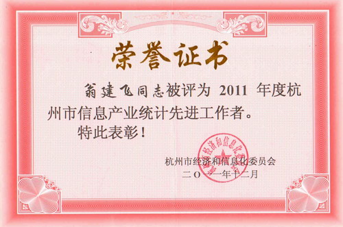 興旺寶明通翁建飛兢兢業業、認真工作,積極學習杭州市信息產業統計相關政策法規,指導日常統計工作,及時準確地報送各項統計報表,得到市委、市政府相關部門多次好評。市經信委為進一步做好2012年的統計工作,鼓勵先進,特予以通報表彰。希望翁建飛等先進工作者再接再厲,在今后的工作中起到榜樣作用,努力做好本職工作,為開創全市信息產業統計工作的新局面作出新貢獻。