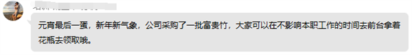 沒(méi)想到吧,你以為元宵活動(dòng)結(jié)束了,但其實(shí)大行政還為我們準(zhǔn)備了一批富貴竹,富貴竹在我們公司算是“老朋友”了,幾乎人人工位上都有那么幾株。通知發(fā)出后,大家井然有序地到前臺(tái)領(lǐng)取,不一會(huì)兒,一桶富貴竹就被領(lǐng)光了。