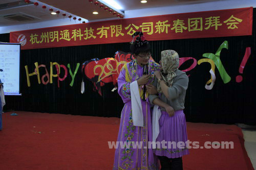 一曲《我的未來不是夢》拉開了新春團拜會演出的序幕,精彩的歌聲、動感的舞步,摩登的走秀,悠揚的笛子,自編自演的小品,互動游戲,讓年會的聯歡氣氛逐步升溫。由礦冶、包裝等網站推出的《明通聯播》以新聞聯播的形式將社會熱聞、明通事件、員工生活串聯起來,更制作了搞怪幽默視頻資料,整個表演過程讓人爆笑不止。食品機械、農機等聯合表演的《駱公子與汪如花》極具創意的反串表演好評連連,獲得了當晚的最佳表演獎。《西游后傳》融合了小品、舞蹈、歌曲等多種形式,中外名段間插其中營造了強烈的娛樂氛圍??头I上的走秀,時尚的風范無疑讓所有人眼前一亮。大行政的街舞組合《舞動青春》,多層次的變換和動感的身姿一展青春活力。技術部的大合唱《相親相愛一家人》唱出了明通大家庭共同的聲音。絢麗多彩的節目,釋放著多才多藝的明通人無限激情??廴诵南业某楠劵顒訉⒄麄€年會多次推向沸騰。所有明通的兄弟姐妹在熱烈的歡呼聲中共同度過了難忘的快樂時光。面對2009,我們將用激情開啟無限美好的未來!
