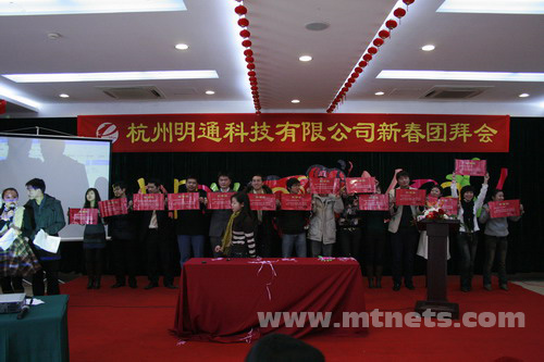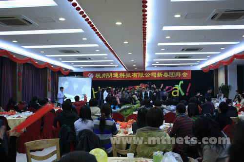 濃濃喜氣迎新春,點燃激情,挑戰2009。1月17日,杭州明通科技有限公司09年新春團拜會在杭州百家苑隆重舉辦。公司總經理陳勝明對全體明通人表示了新年祝賀和衷心的感謝。陳總在團拜會上致辭,回顧2008年輝煌成績,展望2009年精彩明天。他對08年公司規模榮譽、銷售業績、管理制度等方面取得的斐然成績表示充分的肯定,對發展中存在的不足和缺憾進行深入的總結。表示09年明通將繼續保持快速的發展和擴張之路,金融危機的冬天不會阻擋明通大步前進的步伐。堅持以創新發展的思路,全面升級服務環節,以提升企業網絡競爭力為使命,為客戶創造更大的價值,推動行業企業電子商務發展進程。他激勵所有員工迎難而上,充滿激情,一起挑戰2009!